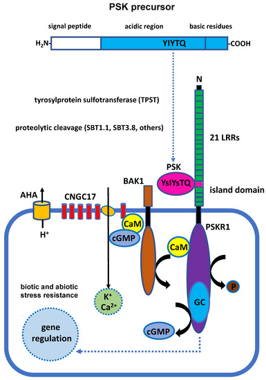 Phytosulfokine (PSK) is a disulfated pentapeptide that has been identified as a growth factor in plants. PSK was initially isolated from the mesophyll cells of Asparagus officinalis in a culture medium [1]. It was hypothesized that PSK was made up of two components, PSK-α and PSK-β, that differed from each other due to a tiny structural variation. More recently, experimental evidence has demonstrated that PSK-β is the degradational byproduct of PSK-α [2]. PSK–γ and PSK-ε, both of which belong to the PSK family, have recently been identified in soybean (Glycine max) and Medicago truncatula, respectively [3,4]. Similarly to most small, post-translationally modified peptides, mature and active PSK that is derived from a precursor preproprotein has to be modified and cleaved. PSK is a precursor protein that must be sulfonated at both tyrosines by tyrosylprotein subfotransferase (TPST), localized in the Golgi apparatus, and further cleaved by subtilisin-like serine proteases (SBTs) in the cytoplasmic matrix. AtSBT1.1 and AtSBT3.8 have been demonstrated to participate in the proteolytic cleavage of AtPSK4 and AtPSK1 propeptides, respectively [5,6,7]. It is still unknown whether other SBT family members or even unidentified proteases are also involved in the modification of PSK preproproteins. After processing, mature PSK binds to the PSK receptor proteins (PSKRs) localized at the plasma membrane. PSKRs have a canonical guanylate cyclase (GC) core and act upstream of cGMP and PSK signaling; therefore, they must undergo sophisticated signal transduction within cells. The regulation of signal transduction is also mediated by the response modules of cyclic nucleotide-gated channel 17 (CNGC17), H+-ATPase AHA1 and AHA2, and BRI-associated receptor kinase 1 (BAK1) on the plasma membrane [8].