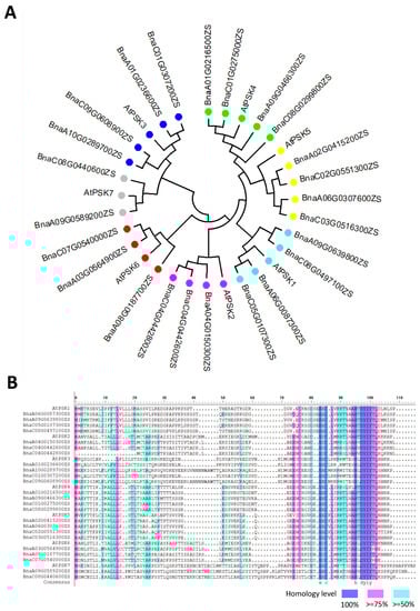 Alignment of PSK precursor proteins in A. thaliana and B. napus. (A) The Neighbor-Joining (NJ) phylogenetic tree regarding the PSK precursor proteins was constructed with MEGA7 software, based on amino acid alignment between A. thaliana and B. napus. Dots with the same color represent homologous proteins. This is an originally developed figure. (B) The amino acid alignment reveals the conserved domain in the PSK precursor proteins. The amino acid sequence was obtained from an online database (http://yanglab.hzau.edu.cn/BnTIR (accessed on 20 June 2023)). Sequence alignment was performed with DNAman8 software. This is an originally developed figure.