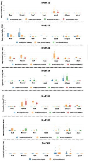 Expressional profiles of PSK precursor genes in different plant tissues of B. napus. The data of the expressional profiles were obtained from an online database with slight modifications (http://yanglab.hzau.edu.cn/BnTIR (accessed on 20 June 2023)).