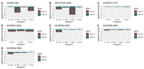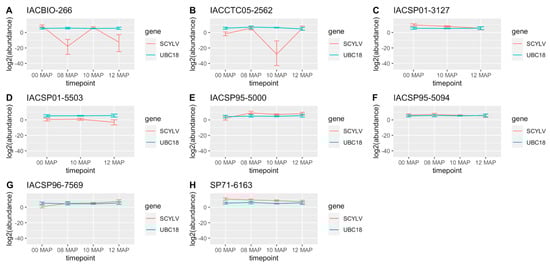 Virus titer variations significant at the 95% credible interval among sampling times were observed for all genotypes, except for IACSP01-5503 and SP71-6163 (Figure 1). These variations comprise the increase in virus titer between 0 and 8 MAP, decrease between 8 and 10 MAP, and increase between 10 and 12 MAP for IACCTC05-2562 and the reverse trend, i.e., the decrease between 0 and 8 MAP, increase between 8 and 10 MAP, and decrease between 10 and 12 MAP, for IACBIO-266. Increases in virus titer between 0 and 8 MAP were also observed for IACSP95-5000 and IACSP96-7569, with the latter also showing an increase in virus titer between 8 and 12 MAP, while decreases between 0 and 12 MAP were observed for IACSP01-3127 and IACSP95-5094, and also between 8 and 12 MAP for the latter. The genotypes with significantly higher virus titer across sampling times were SP71-6163, IACSP01-3127, and IACBIO-266 at 0 MAP; SP71-6163, IACSP95-5000, and IACSP95-5094 at 8 MAP; SP71-6163, IACSP01-3127, and IACSP95-5000 at 10 MAP; and IACSP95-5000, IACSP96-7569, SP71-6163, IACCTC05-2562, IACSP01-3127, and IACSP95-5094 at 12 MAP. It is noteworthy that the susceptible reference genotype, i.e., SP71-6163, was amongst those with higher virus titer across all sampling timepoints. The virus titer fold change in relation to SP71-6163 revealed either significantly lower SCYLV titers or non-significant values in the remaining cultivars across sampling timepoints, according to the 95% credible intervals (Figure 2). The average values of the significant virus titer fold decrease ranged from 4.48 × 10−2 to 2.7 × 10−4 for IACSP95-5094, IACSP96-7569, IACSP01-5503, IACSP95-5000, and IACCTC05-2562 at 0 MAP; from 2.91 × 10−1 to 9.11 × 10−9 for IACSP95-5094, IACSP96-7569, IACCTC05-2562, and IACBIO-266 at 8 MAP; from 3.15 × 10−1 to 1.21 × 10−11 for IACSP95-5000, IACBIO-266, IACSP95-5094, IACSP96-7569, IACSP01-5503, and IACCTC05-2562 at 10 MAP; and from 9.93 × 10−4 to 1.7 × 10−6 for IACSP01-5503 and IACBIO-266, respectively. The non-significant fold changes were observed for IACSP01-3127 and IACBIO-266 at 0 MAP; IACSP95-5000 at 8 MAP; IACSP01-3127 at 10 MAP; and IACSP95-5000, IACSP96-7569, IACSP01-3127, IACCTC05-2562, and IACSP95-5094 at 12 MAP.