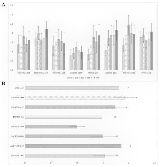 (A) Ln (x + 5) transformed mean number of apterous adult non-viruliferous Melanaphis sacchari per sugarcane cultivar at short (0.5, 1, 3, 6 h) and long-term (24 h) intervals after the release of fifty individuals in a free-choice bioassay. The differences among cultivars are not significantly different according to the LSD test after one-way ANOVA for each timepoint (p > 0.05). Error bars represent the standard error (n = 16). (B) Ln (x + 5) transformed mean number of adult non-viruliferous M. sacchari per sugarcane cultivar, each consisting of the mean of the five timepoints. Means with the same letter are not significantly different according to the LSD test after two-way ANOVA with all observations (p < 0.05). Error bars represent the standard error (n = 80).