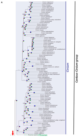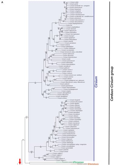 The Carduus-Cirsium group as currently defined (e.g., Susanna and Garcia-Jacas, 2007 [14]) encompasses ca. 550 species in six genera (Table 1): Carduus L. (ca. 100 species, Eurasia and eastern Africa), Cirsium Mill. (ca. 450 species, Eurasia, North America, northern and eastern Africa), Notobasis (Cass.) Cass. (one species, Eurasia), Picnomon Adans. (one species, Eurasia), Silybum Adans. (two species, subcosmopolitan) and Tyrimnus Cass. (one species, Mediterranean). The Carduus-Cirsium group remains the most taxonomically problematic group in the Carduinae [15,16]. Current species of Cirsium have been classified into at least 16 different genera, and its delimitation is still controversial, leading to multiple reclassifications of many Carduinae into different genera [15,17,18,19,20]. These delimitation difficulties are confounded by (1) low phylogenetic resolution in previous studies based on nuclear ribosomal transcribed spacers (ETS and ITS), a few low-copy nuclear genes and plastid regions [17,19,20,21,22,23,24,25]; (2) morphological convergence in response to similar environmental conditions [26,27]; and (3) hybridization as a recurrent mechanism of speciation within the tribe Cardueae [28].