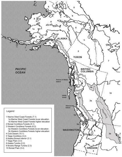 Northwestern North America—the region extending from the Columbia River north to central Alaska and east to the Rocky Mountains—includes approximately 20 major vegetation zones, varying in terms of topography, elevation, and latitude [2] (as shown in Figure 1 and Figure 2). Most of these are forested; for instance, there are maritime forests along the west coast at lower and higher elevations, boreal and sub-boreal forests, interior dry forests, interior wet belt forests, and interior high-elevation forests, as well as alpine, tundra, and interior dry grasslands. Each has its own complement of habitats, successional stages, and associated species. In all, there are approximately 2500 native vascular plant species in the region, as well as a diversity of marine algae, fungi, lichens, and bryophytes.