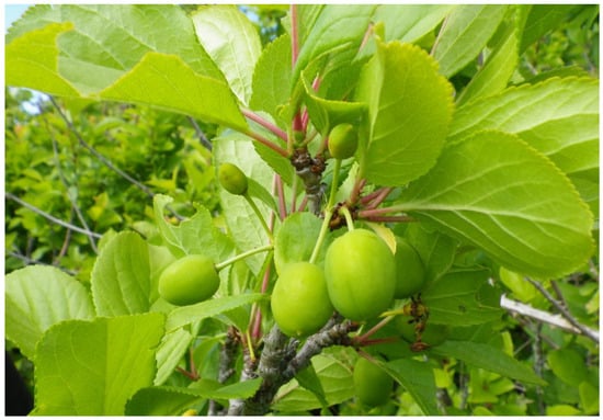 Small unripe plums growing in an Indigenous home site at Tl’ches near Victoria, British Columbia, planted in the 1800s. Photo taken June 2011 (N. Turner).