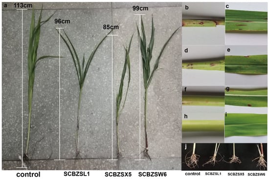 (a) Plant height of healthy sorghum–sudangrass hybrid and diseased sorghum–sudangrass hybrid inoculated with three pathogens. (b,c) SCBZSL1 was inoculated back to the stems and leaves of the diseased sorghum–sudangrass hybrids. (d,e) SCBZSX5 was inoculated back to the diseased sorghum–sudangrass hybrids’ stems and leaves. (f,g) SCBZW6 was inoculated back to the diseased stems and leaves of sorghum–sudangrass hybrids. (h,i) Healthy sorghum–sudangrass hybrids’ stem and leaf. (j) The root development of healthy sorghum–sudangrass hybrids and plants inoculated with three pathogens.