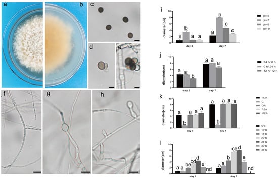 The front and back morphology of N. sphaerica. (a,b) PDA cultured for 7 days. (c) Conidia. (d,e) Meristematic cells and spores. (f–h) Different forms of mycelium, mycelium branching. (i) The average colony diameter of N. sphaerica cultured for 3 d/7 d under different pH conditions. (j) The average colony diameter of N. sphaerica cultured for 3 d/7 d under different light duration. (k) The average colony diameter of N. sphaerica cultured in different media for 3 d/7 d. (l) The average colony diameter of N. sphaerica cultured for 3 d/7 d under different temperature conditions. Gauge = 10 μM. The same lowercase letter in the chart indicates that the difference is not significant (p > 0.05), the difference is significant (p < 0.05), and the nd indicates that it is below the minimum scale or resolution.