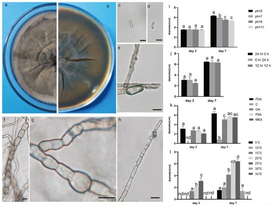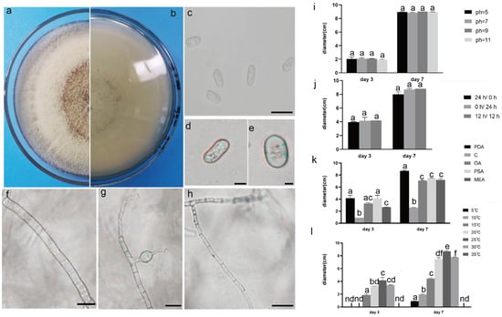 The front and back morphology of D. corylicola. (a,b) PDA cultured for 7 days. (c,d) Conidium. (e) Spores are forming. (f) Mycelium is chain. (g) Hyphal protrusions. (h) Spores are forming on hyphae. (i) The average colony diameter of D. corylicola cultured for 3 d/7 d under different pH conditions. (j) The average colony diameter of D. corylicola cultured for 3 d/7 d under different light durations. (k) The average colony diameter of D. corylicola cultured in different media for 3 d/7 d. (l) The average colony diameter of D. corylicola cultured for 3 d/7 d under different temperature conditions. Gauge = 10 μM. The same lowercase letter in the chart indicates that the difference is not significant (p > 0.05), the difference is significant (p < 0.05), and the nd indicates that it is below the minimum scale or resolution.