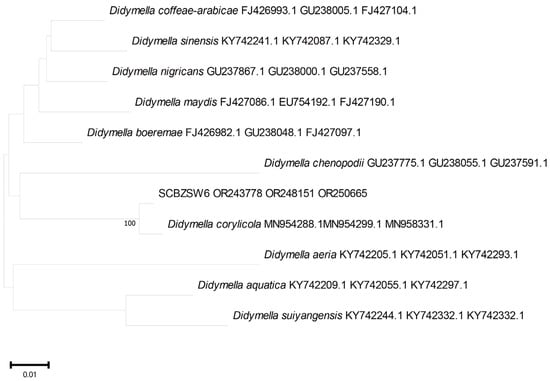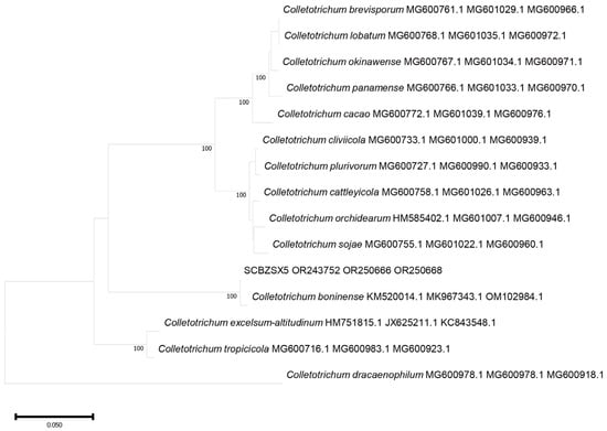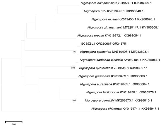 All the obtained sequences were input into GenBank BLAST for homologous sequence search to find strains with high similarity (Table 2). The ITS and BT sequences of the strain SCBZSL1 were deposited in GenBank, and the accession numbers OR243751 and OR250667 were obtained. The ITS, BT, and ACT gene sequences of the strain SCBZSX5 were submitted to GenBank with accession numbers OR243752, OR250666, and OR250668. The ITS, LSU, and BT gene sequences of the strain SCBZSW6 were submitted to GenBank with accession numbers OR243778, OR248151, and OR250665. Construct a phylogenetic tree using the ITS and BT sequences of SCBSZL1, the ITS, BT, and ACT sequences of SCBZSX5, and the ITS, LSU, and BT sequences of SCBZSW6, respectively, with the relevant reference sequences in Table 2. N. sphaerica, C. boninense, and D. corylicola isolates formed clades that clustered together with SCBZSL1, SCBZSX5, and SCBZSW6, respectively (Figure 5, Figure 6 and Figure 7). These clades were supported by 100% bootstrap values, which confirmed the identification of three pathogenic strains.