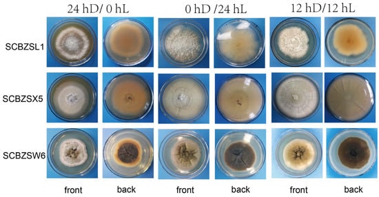 All strains had strong adaptability to light duration, and the morphology of pathogens changed as illuminated by different light regimes (Figure 8). The 0 hD/24 hL condition was the most suitable for the growth of the three strains. Under this condition, the morphology of SCBZSW6 changed, the overall colony became gray–white, the middle was yellow with black spots, and the back matrix did not change. The color of the SCBZSX5 colony changed from light cream to darker yellow. When cultured at the light condition of 24 hD/0 hL, the growth speed of SCBZSL1 significantly decreased, and the mycelium of the middle layer became thinner. A semi-transparent ring appeared around the colony of SCBZSX5. Under the condition of 12 hD/12 hL, the mycelium of SCBZSL1 was the densest, and the back matrix was annually ring-shaped, and no cross crack was found. SCBZSL1 and SCBZSW6 did not produce spores under three light conditions (Table 2). The effects of the illumination duration on SCBZSX5 were significantly different (p < 0.05).