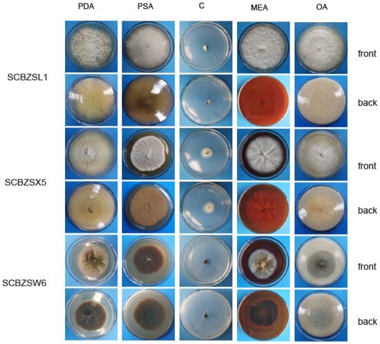 The growth status of the three strains on the tested medium was significantly different (Figure 9). SCBZSL1, SCBZSX5, and SCBZSW6 obtained the fastest growth rate on PDA plates, and the average diameters of 7-day-old colonies were 8.1 cm, 8.7 cm, and 6.4 cm, respectively. When cultured on Salt Czapek Dox Agar (SCDA), the growth speed of the three pathogens was the slowest, and the diameters of the 7-day-old colonies were 1.1 cm, 2.6 cm, and 0.8 cm, respectively. This indicates that the three pathogens have higher utilization efficiency of glucose. Compared with the morphology of SCBZSL1 cultured on PDA, the mycelium of SCBZSL1 cultured on Oatmeal Agar (OA) and Potato Saccharose Agar (PSA) was denser and the middle part was villous. The mycelial of SCBZSX5 changed significantly on different media. The colonies cultured by PSA were white, very short villi, and wrinkled, while the morphology on Malt Extract Agar (MEA) and OA culture showed snowflake folds, short villi, and denser hyphae accompanied by small voids. As for SCBZSW6, the colonies on PSA, MEA, and OA exhibited different characteristics. The colonies of SCBZSW6 cultured in PSA were brown and bark-like folds, the ones cultured in MEA were yellow–green in the middle and gray–white in the periphery, while the colonies cultured in OA were gray–white with dark gray marks on the surface. SCBZSL1 and SCBZSW6 also did not produce spores. SCBZSX5 produced spores only when cultured in PDA and PSA, and the number of spores produced by SCBZSX5 cultured in PDA was the highest (6.8 × 104 cfu/mL).