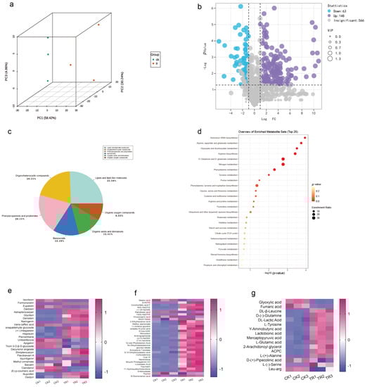 (a) Principal component analysis (PCA) of sorghum–sudangrass hybrids treated with SCBZSX5 and healthy sorghum–sudangrass hybrids. (b) Using GraphPad Prism 8.0 software to create volcano maps, the purple part indicates that the differential metabolites are up-regulated, the blue part indicates that the differential metabolites are down-regulated, and the gray part indicates the insignificant metabolites. (c) Differential metabolite classification chart created using Excel 2019. (d) Differential metabolism chemicals were analyzed using Metaboanalyst 5.0 for important metabolic pathways, the KEGG database was used to annotate and construct the pathway, the x-axis denotes the pathway impact, the y-axis represents pathway enrichment, the circle size denotes pathway to impact, and the circle color from red to yellow represents the p-value (p < 0.05) becoming smaller. (e–g) Using the online graphing tool Metware Cloud and GraphPad Prism 8.0 software, potential differential metabolites were screened according to different projected significance (VIP > 1 and p < 0.05), and differential metabolites’ heat maps of flavonoids and isoflavones, differential metabolites’ heat maps of lipid and lipid molecules, heat maps of differential metabolites of organic acids, and their derivatives were generated.