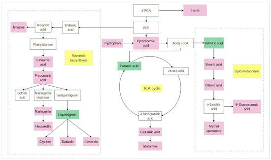 Analyze relevant data from MetaboAnalyst and KEGG websites to identify key differential metabolites, and then use Adobe Illustrator 2021 V25.3.1.390 mapping software to obtain pathway maps. The white box in the diagram represents an undetected metabolite. The pink box represents significant enrichment of metabolites. The green box represents a significant reduction in metabolites. The yellow box represents the metabolic pathway.