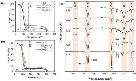The morphology and particle size of SLNs were determined by STEM using a HITACHI SU3500 scanning electron microscope (Hitachi®, Tokyo, Japan). Additionally, SLNs were characterized by their size, polydispersity index (PDI), and surface charge (ζ-potential) using dynamic light scattering (DLS) (Zetasizer Nano ZS90, Malvern Instruments, Inc., Malvern, UK). TGA was carried out using Simultaneous Thermal Analyzer (STA) 6000 (PerkinElmer, Waltham, MA, USA), where ~20 mg of sample was placed into a ceramic pan and then exposed to a nitrogen atmosphere from 25 to 500 °C at a heating rate of 15 °C min−1. FTIR was carried out using an Agilent Technologies Cary (Santa Clara, CA, USA) 630 FTIR spectrophotometer, where the spectra were obtained with the transmittance between the frequencies of 3600 and 600 cm−1 [].
