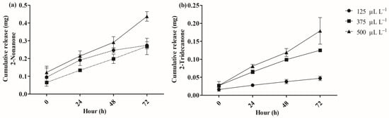 Figure 3 shows the controlled release of encapsulated doses (125, 375, or 500 µL L−1) of 2-nonanone and 2-tridecanone from SLNs during 72 h. A greater release was observed as the encapsulated dose of the compound increased. Encapsulated doses of 2-nonanone at 125, 375, and 500 µL L−1 released 0.13, 0.19, and 0.21 mg at 24 h and 0.26, 0.27, and 0.43 mg at 72 h (Figure 3a). Furthermore, encapsulated doses of 2-tridecanone at 125, 375, and 500 µL L−1 released 0.016, 0.026, and 0.027 mg at 24 h and 0.047, 0.12, and 0.17 mg at 72 h (Figure 3b). The results indicated a more significant release of 2-nonanone compared with 2-tridecanone (about three times).
