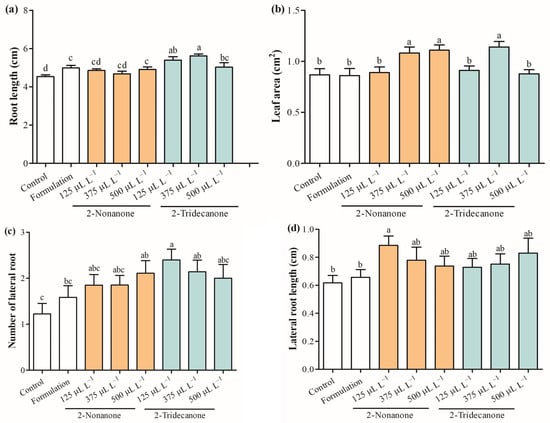 Growth promotion on L. sativa seedlings on day 14 modulated by different doses of 2-nonanone and 2-tridecanone released from SLNs. (a) Root length, (b) leaf area, (c) number of lateral root length, and (d) lateral root length. Letters indicate statistically significant differences according to the ANOVA test (p < 0.05, Tukey test) (N = 20–30). Bars indicate standard error.