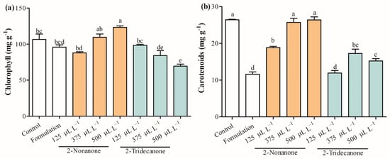 Total (a) chlorophyll and (b) carotenoid contents in leaves of L. sativa exposed to doses of 2-nonanone and 2-tridecanone released from SLNs on day 14. Letters indicate statistically significant differences according to the ANOVA test (N = 3, p < 0.05, Tukey test).