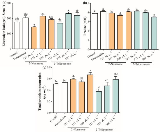 (a) Electrolyte, (b) leakage, (c) proline, and total protein concentration on seedling leaves of L. sativa exposed to doses of 2-nonanone and 2-tridecanone released from SLNs on day 14. Letters indicate statistically significant differences according to the ANOVA test (N = 3, p < 0.05, Tukey test).
