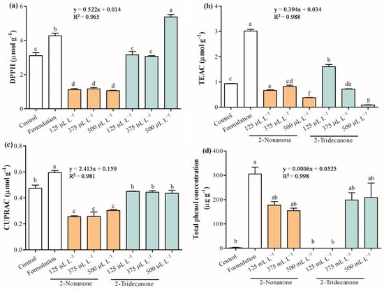 Antioxidant activity evaluated in leaves of L. sativa mediated by doses of 2-nonanone and 2-tridecanone released from SLNs on day 14. (a) 2,2-Diphenyl-1-picrylhydrazyl (DPPH) radical, (b) Trolox equivalent antioxidant activity (TEAC), (c) cupric ion-reducing antioxidant activity (CUPRAC), and (d) total phenol concentration. Letters indicate statistically significant differences according to the ANOVA test (N = 3, p < 0.05, Tukey test).