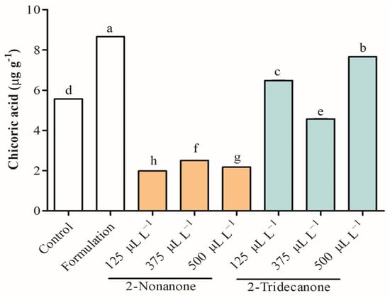 Chicoric acid identification and concentration in leaves of L. sativa seedlings exposed to doses of 2-nonanone and 2-tridecanone released from SLNs. Letters indicate statistically significant differences according to the ANOVA test (N = 3, p < 0.05, Tukey test).