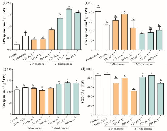Antioxidant enzymes evaluated on seedlings of L. sativa mediated by 2-nonanone and 2-tridecanone released from SLNs on day 14. (a) Ascorbate peroxidase (APX), (b) catalase (CAT), (c) peroxidase (POX), and (d) superoxide dismutase (SOD). Letters indicate statistically significant differences according to the ANOVA test (N = 3, p < 0.05, Tukey test).