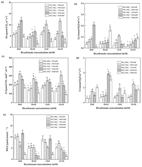 Different responses of photosynthesis to bicarbonate and ammonium in Bn and Ov. Bn: Brassica napus; Ov: Orychophragmus violaceus. B0: 0 mM HCO3−; B10: 10 mM HCO3−; NO3− concentration: 15 mM; NH4+: 0/0.5/2/10/20 mM. (a) Pn: net photosynthetic rate, μmol CO2·m2·s−1; (b) Gs: stomatal conductance, mmol H2O·m2·s−1; (c) Ci: intercellular carbon dioxide concentration, μmol CO2·mol·air −1; (d) Tr: transpiration, μmol H2O·m2·s−1; (e) WUE: water use efficiency, μmol·mmol−1. “*” represents a p-value less than 5% level of significance. Each value represents the mean ± SD (n = 3), and diverse letters in each value are significantly different by ANOVA (p ≤ 0.05).