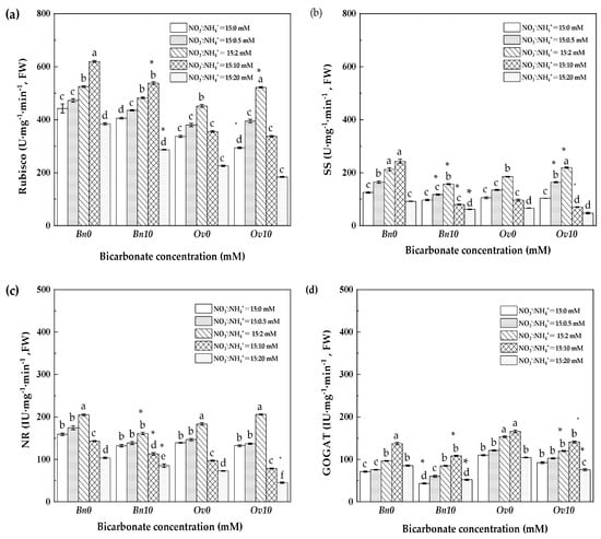 Rubisco, SS, NR, and GOGAT activities of Bn and Ov under different bicarbonate and ammonium supplies. Bn: Brassica napus; Ov: Orychophragmus violaceus. B0: 0 mM HCO3−; B10: 10 mM HCO3−; NO3− concentration: 15 mM; NH4+: 0/0.5/2/10/20 mM. (a) Rubisco: ribulose bisphosphate carboxylase oxygenase, U·mg−1·min−1; (b) SS: sucrose synthetase, U·mg−1·min−1; (c) NR: nitrate reductase, IU·mg−1·min−1; (d) GOGAT: glutamate synthase, IU·mg−1·min−1. “*” represents a p-value less than 5% level of significance. Each value represents the mean ± SD (n = 3), and diverse letters in each value are significantly different by ANOVA (p < 0.05).
