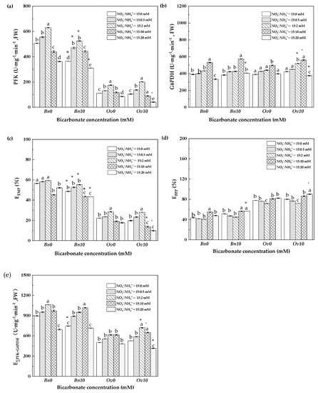 The glycolysis pathway and the pentose phosphate pathway of Bn and Ov at different bicarbonate and ammonium levels. Bn: Brassica napus; Ov: Orychophragmus violaceus. B0: 0 mM HCO3−; B10: 10 mM HCO3; NO3− concentration: 15 mM; NH4+ concentration: 0/0.5/2/10/20 mM. (a) PFK: Phosphofructokinase, U·mg−1·min−1; (b) G6PDH: Glucose-6-phosphate dehydrogenase, U·mg−1·min−1; (c) EEMP: the contribution of the glycolytic pathway, %; (d) EPPP: the contribution of the pentose phosphate pathway, %; (e) E∑EMP+PPP: total glucose metabolism, U·mg−1·min−1. “*” represents a p-value less than 5% level of significance. Each value represents the mean ± SD (n = 3), and diverse letters in each value are significantly different by ANOVA (p < 0.05).