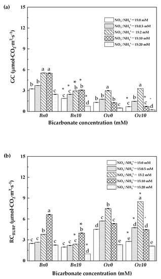 Growth capacity and regeneration capacity of RUBP in Bn and Ov at different bicarbonate and ammonium levels. Bn: Brassica napus; Ov: Orychophragmus violaceus. B0: 0 mM HCO3−; B10: 10 mM HCO3; NO3− concentration: 15 mM; NH4+ concentration: 0/0.5/2/10/20 mM. (a) GC:Growth capacity, μmol CO2·m2·s−1; (b) RCRUBP: the regeneration capacity of Ribulose-1,5-bisphosphate, μmol CO2·m2·s−1. “*” represents a p-value less than 5% level of significance. Each value represents the mean ± SD (n = 3), and diverse letters in each value are significantly different by ANOVA (p ≤ 0.05).