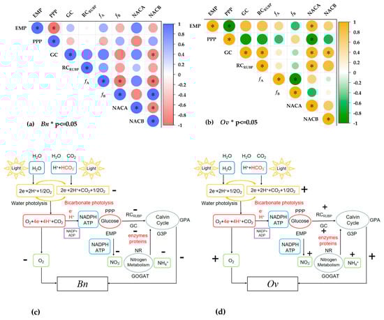 The correlation between glucose metabolism and inorganic nitrogen use of Bn and Ov at different bicarbonate and ammonium levels. Bn: Brassia naps; Ov: OTychoplhragmus violaceu. B0: 0 mM HCO3−; B10:10 mM HCO3−; NO3−; concentration: 15 mM; NH4+ concentration: 0/0.5/2/10/20 mM. (a) The correlation between glucose metabolism and inorganic nitrogen use of Bn; (b) the correlation between glucose metabolism and inorganic nitrogen use of Ov; (c) the inorganic carbon and nitrogen mechanisms in Bn at different bicarbonate and ammonium levels; (d) the inorganic carbon and nitrogen mechanism in Ov at different bicarbonate and ammonium levels. “*” represents a p-value less than 5% level of significance.
