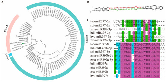 Figure 1. Phylogenetic relationship analysis of miR397 and second structure of tae-miR397 precursor. (A) The phylogenetic tree was built using the Maximum likelihood method with 1000 bootstrap replicates in MEGA 7.0. (B) Prediction of the secondary structure of the precursor tae-miR397. Base-in red indicates the mature sequence of miR397-5p; Base-in green indicates the mature sequence of miR397-X. (C) Alignment of mature miR397 in grass species.