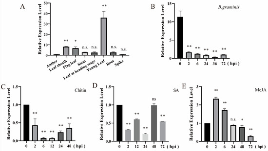 Figure 2. Expression pattern of tae-miR397. (A) Expression pattern of tae-miR397 in wheat issues. (B) Expression pattern of tae-miR397 in wheat variety Bainong207 seedling leaves inoculated with Bgt. (C) Expression pattern of tae-miR397 in wheat variety Bainong207 seedling leaves after chitin treatment. (D) Expression pattern of tae-miR397 in wheat variety Bainong207 seedling leaves after SA treatment. SA, salicylic acid. (E) Expression pattern of tae-miR397 in wheat variety Bainong207 seedling leaves after MeJA treatment. MeJA, methyl jasmonate. Relative expression levels are representative of the mean values of three biological replicates. Error bars represent one standard deviation (SD). The * and ** represent significant differences at the levels of p < 0.05 and p < 0.01 between the control and treatment groups using Tukey’s multiple comparisons test.