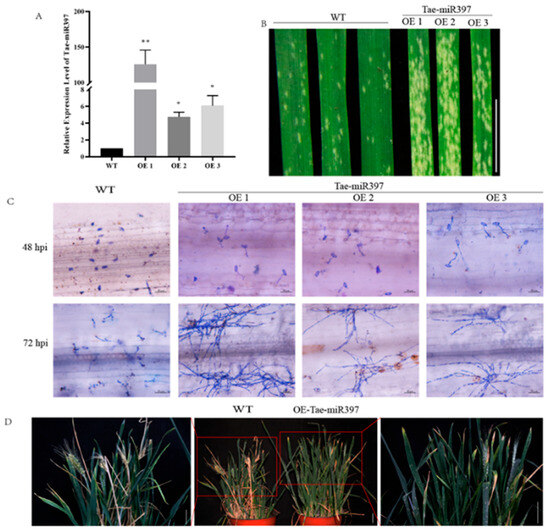 Figure 3. Overexpression of tae-miR397 reduces wheat resistance against B. graminis (A) Expression levels of tae-miR397 in miR397-OE plants and WT plants. The * and ** represent significant differences between WT and transgenic plants at p < 0.05 and p < 0.01 using Tukey’s multiple comparisons test. (B) The disease phenotype of detached leaves from miR397-OE plants and the control Bainong207 inoculated with Bgt at the seedling stage. Bar: 3 cm (C) Microscopic observation of Bgt development in miR397-OE plants and WT plants leaves inoculated with Bgt fungus for 48 and 72 h. Bar: 50 μm. (D) The disease phenotype of whole adult plants inoculated with Bgt in the heading stage. Bar: 5 cm; WT: Wild-type wheat variety Bainong207; OE: Transgenic plants overexpressing tae-miR397.