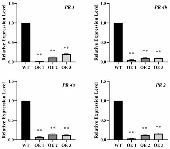 Figure 4. Relative expression levels of PR genes in seedlings with Bgt inoculation. The relative expression levels of four PR genes are representative of the mean values of three biological replicates. The ** represent significant differences between WT and transgenic plants inoculated with Bgt at the levels of p < 0.05 and p < 0.01 using Tukey’s multiple comparisons test. WT: Wild type wheat variety Bainong207. OE: Transgenic plants overexpressing tae-miR397.
