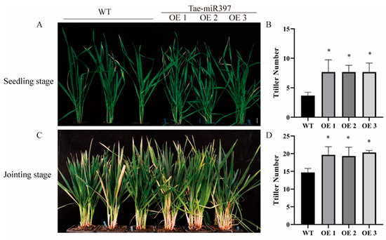 It is well known that miR397 plays an important role in regulating plant growth and development. Transgenic lines overexpressing tae-miR397 in T2 and T3 generations were used for phenotypic observation in different developmental stages. We found only differences in the number of tillers between transgenic and WT plants during the development process. In the tillering stage, miR397-OE plants showed a considerable increase in tillers compared to wild-type Bainong207 plants (Figure 5A), with an increase of approximately 2.3 tillers (Figure 5B). In the jointing stage, miR397-OE transgenic lines still developed more tillers than the wild-type wheat Bainong207 (Figure 5C), with an increase of approximately three tillers (Figure 5D). These results indicated that tae-miR397 plays a positive role in promoting wheat tillering.
