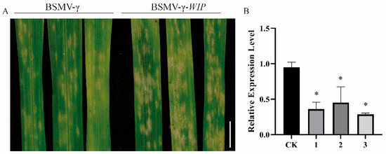 Figure 6. Functional analysis of Tae-WIP using BSMV-VIGS in Bainong207. (A) BSMV: WIP-infected plants were inoculated with Bgt, and their leaves were photographed at 7 dpi. BSMV:γ infected plants were used as controls. Bar: 1 cm. The experiment was repeated independently three times, and the same results were obtained. (B) Expression levels of Tae-WIP in BSMV:WIP-infected and BSMV:γ-infected leaves. CK represents plants inoculated with BSMV:γ, and 1–3 represents wheat Bainong207 plants inoculated with BSMV:WIP. The * represents significant differences between plants inoculated with BSMV:γ and plants inoculated with BSMV:WIP at the level of p < 0.05 using Tukey’s multiple comparisons test.