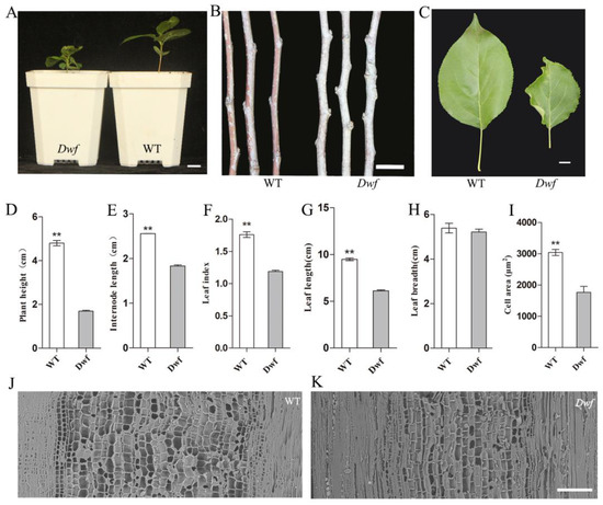 The cytological differences in the two genotypes were studied using SEM. The cell area in the xylem regions of annual branches of the Dwf was 42% smaller than the WT (Figure 1I); it revealed that there were dramatically smaller longitudinal vascular bundles cells in the annual branches of the Dwf mutant than in the WT (Figure 1J,K).