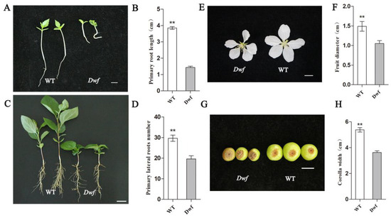 Furthermore, the root morphology, flowers, and fruits of Dwf mutant were significantly altered. It exhibited shorter primary roots (PR) (Figure 2A,B), fewer lateral roots (LR) (Figure 2C,D), and decreased corolla width and fruit diameter (Figure 2E–H).