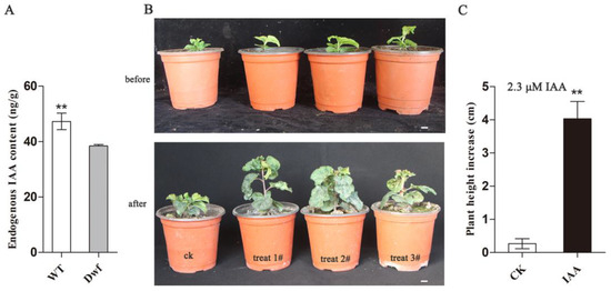 To investigate whether DEGs related to auxin signaling and biosynthesis pathways are associated with the change in endogenous auxin levels, endogenous IAA levels were detected in both genotypes. Endogenous IAA content was substantially lower in the leaves of the Dwf mutant than in those of the WT (Figure 4A). We investigated whether auxin deficiency in Dwf mutant affected the dwarfing. One-month-old Dwf seedllings were sprayed with 0.4 mg·L−1 IAA once a week for 4 weeks and plant growth was observed. Interestingly, plant height was significantly increased in the Dwf mutant after IAA treatment compared to after water treatment (Figure 4B,C). These findings suggested that the endogenous auxin levels were altered in the Dwf mutant, and this alteration played a key role in dwarfing.