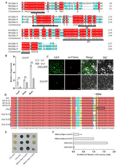 MbIAA19 is a member of the AUX/IAA gene family. Sequence analysis revealed that MbIAA19 contains an open reading frame of 573 bp, encoding 190 amino acids; the MbIAA19 sequences from WT and Dwf were identical. After aligning with IAA19 protein sequences from P. persica and A. thaliana, it was revealed that MbIAA19 proteins contain four conserved domains (domains I, II, III, and IV; Figure 5A). The expression of MbIAA19 in several tissues was studied using qRT-PCR. It was significantly downregulated in the roots, stems, and leaves of Dwf plants (Figure 5B). Next, we performed a subcellular localization analysis of MbIAA19. In contrast to the 35S::GFP protein (which was identified in both the cytoplasm and nucleus when released alone in vivo in the leaf epidermal cells of tobacco), the GFP-IAA19 fusion proteins and mCherry protein were primarily located in the nucleus (Figure 5C). The sequences of the MbIAA19 promoters in WT and Dwf mutant were compared to identify any mutation in the promoter region. A single nucleotide change from G to A (−608 bp) was observed in Dwf; it was a heterozygous mutation in Dwf mutant and seedlings with Dwf phenotype. The altered promoter creates a novel cis-acting element [(A/T)GATA(A/G)], a GATA transcription factor binding site. (Figure 5D). Further, GUS activity was analyzed to assess how variation in the alleles affects the activities of the MbIAA19 promoter. Interestingly, altered promoters in tobacco leaves exhibited markedly reduced levels of GUS protein and GUS activity (Figure 5E,F and Figure S3). These findings suggest that MbIAA19 is a candidate gene responsible for the Dwf mutant phenotype.