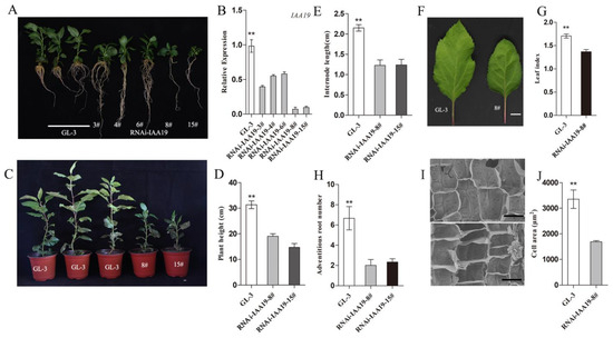 Morphological characterization of the RNAi-IAA19 lines compared with GL-3. (A) Universal morphology of GL-3 and five RNAi-IAA19 lines. (B) Expression level of IAA19 in GL-3 and five RNAi-IAA19 lines. (C) GL-3 and RNAi-IAA19 lines after grown in the incubator for 2 months. Scale bar = 1 cm. (D) Plant height of GL-3 and two RNAi-IAA19 lines (8# and 15#). (E) Internode length of GL-3 and two RNAi-IAA19 lines (8# and 15#). (F) Images of the leaves from the third leaves of 2-month-old seedlings of GL-3 and RNAi-IAA19-8#. Scale bar = 1 cm. (G) Comparison of the ratio of leaf length to width of RNAi-IAA19 lines and GL-3. (H) Adventitious root numbers of GL-3 and two RNAi-IAA19 lines (8# and 15#). (I) Scanning electron microscopic analysis of longitudinal segment of the stems of GL-3 (up) and RNAi-IAA19-8# (down), Scale bar = 40 μm. (J) Calculation of cell areas of the stems of GL-3 and RNAi-IAA19-8#. The asterisks above the error bars in (B,D,E,G,H,J) indicate significant differences at p < 0.01 using a one-way ANOVA and Dunnett’s test.
