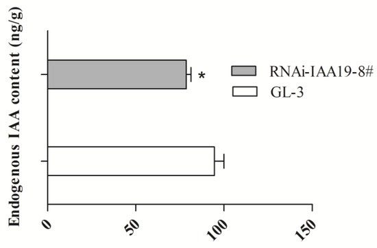 Endogenous auxin levels in GL-3 and RNAi-IAA19-8# leaves. The asterisks above the error bars indicate significant differences at p < 0.05 using a one-way ANOVA and Dunnett’s test.