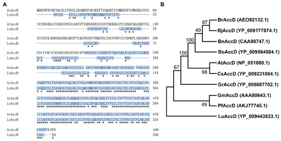 Protein sequence alignment and phylogenetic analysis of AccD. (A) Sequence alignment of amino acids from LuAccD and AtAccD. The asterisks represent strictly conserved amino acids. The crotonase-like superfamily domain, which was predicated by the NCBI Conserved Domain Database (https://www.ncbi.nlm.nih.gov/Structure/cdd/wrpsb.cgi, accessed on 20 October 2022), is highlighted in blue in the sequences. (B) Phylogenetic analysis of AccD proteins from L. usitatissimum, A. thaliana, and other crops. Numbers indicate the phylogenetic confidence of the tree topology and denote the bootstrap values on neighbor-joining analysis. Br: Brassica rapa, Bj: Brassica juncea, Bn: Brassica napus, Bo: Brassica oleracea var. oleracea, At: Arabidopsis thaliana, Cs: Camelina sativa, Gr: Gossypium raimondii, Gm: Glycine max, Pf: Perilla frutescens, Lu: Linum usitatissimum. The accession numbers of AccD are listed in parentheses.
