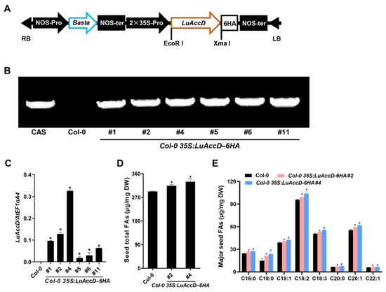 Studies have revealed that the loss of AtAccD function results in embryo lethality of A. thaliana [32]. To preliminarily investigate the functions of LuAccD on the accumulation of seed FAs, we introduced the overexpression construct of 35S: LuAccD–6HA (Figure 2A) into the A. thaliana wild-type (Col-0) plants. We obtained six independent T3 homozygous Col-0 35S: LuAccD–6HA transgenic lines (#1, #2, #4, #5, #6, and #11) and identified them by the analysis of PCR-based DNA genotyping (Figure 2B). Meanwhile, qRT-PCR results showed that the LuAccD expression is not detected in the Col-0, but highly present in the six transgenic lines (Figure 2C). Therefore, we selected Col-0 35S: LuAccD–6HA#2 and Col-0 35S: LuAccD–6HA#4 for follow-up experiments. The phenotype analysis showed that there are no significant differences in the seed coat color, seed size, and 1000-seed weight between Col-0 and Col-0 35S: LuAccD–6HA transgenic plants (#2 and #4) (Figure S1). However, the contents of seed total FAs and all major FA compositions were both significantly elevated in Col-0 35S: LuAccD–6HA plants compared to those in Col-0 (Figure 2D,E). These results suggested that ectopic expression of LuAccD promotes FA accumulation without affecting other measured agronomic traits in A. thaliana seeds.