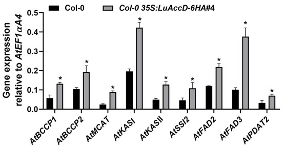 Expression analysis of genes contributing to FA accumulation in the wild-type (Col-0) and Col-0 35S: LuAccD–6HA#4 developing seeds at 12 days after pollination. Results were normalized against the expression of AtEF1αA4 as an internal control. Values are means ± SD (n = 3). Asterisks (*) represent significant differences between Col-0 and Col-0 35S: LuAccD–6HA#4 transgenic plants determined by two-tailed paired Student’s t-test (p ≤ 0.05).