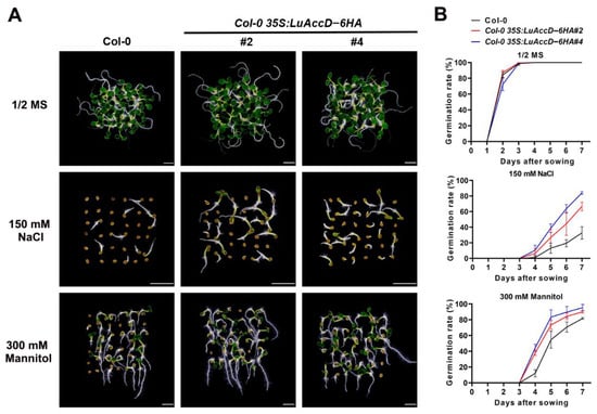 Response of wild-type (Col-0) and transgenic plants overexpressing LuAccD to NaCl and mannitol in seed germination. (A) Germination phenotype of seeds from the different lines grown on 1/2 MS plates or 1/2 MS plates with 150 mM NaCl or 300 mM mannitol for 7 days after sowing. Bar = 2 mm. (B) Germination rates of seeds from the different lines grown on 1/2 MS plates or 1/2 MS plates with 150 mM NaCl or 300 mM mannitol. Seed germination percentages were quantified every day from 1st day to the 7th day after sowing, and the embryonic axis protrusion was considered as seed germination. Date are the means ± SD (n = 3). Error bars denote SD. The value of each biological replicate was the average calculated over three technical replicates. For each technical replicate, we recorded the germination rates of 150 seeds from the same batch.
