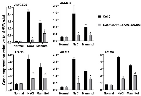 Comparison of relative transcript levels of ABA-related genes between wild-type (Col-0) and Col-0 35S: LuAccD–6HA#4 transgenic plants. Total RNA was extracted from germinating seeds grown on the 1/2 MS or 1/2 MS containing 150 mM NaCl or 300 mM mannitol at 12 h after sowing. The expression levels of genes were calculated relative to that of the internal control AtEF1αA4. Values represent means ± SD (n = 3). Asterisks (*) represent significant differences between Col-0 and Col-0 35S: LuAccD–6HA#4 lines (two-tailed paired Student’s t-test, p ≤ 0.05).