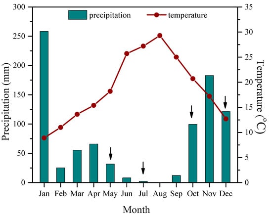 Figure 1. Mean monthly air temperature (°C, red line) and monthly total precipitation (mm, columns) for 2019 in the study area at the Patras University Campus. Arrows denote the measuring dates.