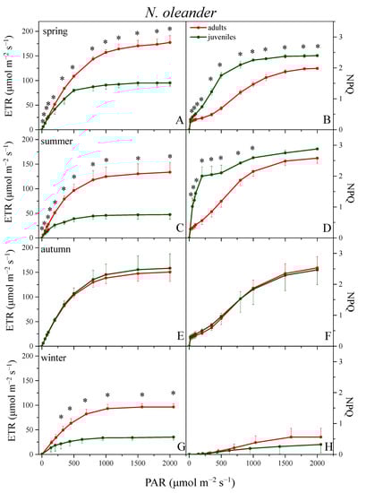 Figure 2. Light response curves of linear electron transport rate (ETR, left panels) and non-photochemical quenching (NPQ, right panels) from adults (red circles) and juveniles (green circles) of N. oleander during spring (A,B), summer (C,D), autumn (E,F), and winter (G,H). Data are means ± SD of 6 measurements (2 measurements/individual). Asterisks denote statistically significant differences (p < 0.05) between adults and juveniles at each light intensity within each season.