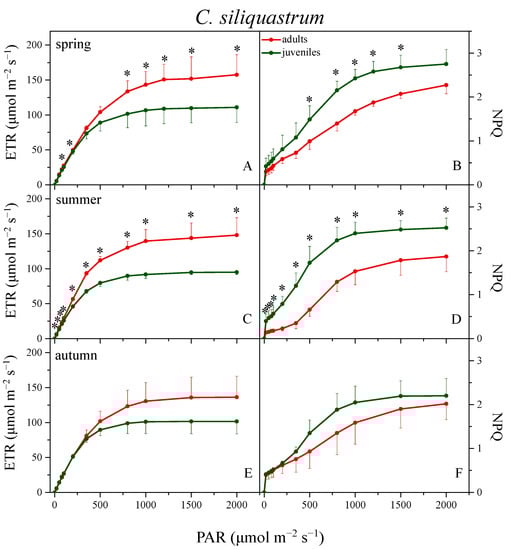 Figure 3. Light response curves of linear electron transport rate (ETR, left panels) and non-photochemical quenching (NPQ, right panels) from adults (red circles) and juveniles (green circles) of C. siliquastrum during spring (A,B), summer (C,D), and autumn (E,F). Data are means ± SD of 6 measurements (2 measurements/individual). Asterisks denote statistically significant differences (p < 0.05) between adults and juveniles at each light intensity within each season.