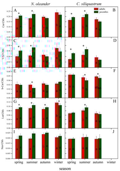 Figure 4. Seasonal variation in total carotenoids (A,B), xanthophyll cycle components (C,D), b-carotene (E,F), lutein (G,H), and neoxanthin (I,J) on a chlorophyll basis (μg μg−1 Chl) for adults (red columns) and juveniles (green columns) of N. oleander (left panels) and C. siliquastrum (right panels). Data are means ± SD of 6 independent extractions. Within each species, asterisks denote statistically significant differences (p < 0.05) between adults and juveniles for the indicated parameter in the same season, while different letters indicate statistically significant differences (p < 0.05) of adults or juveniles between seasons. VAZ: violaxanthin + antheraxanthin + zeaxanthin.
